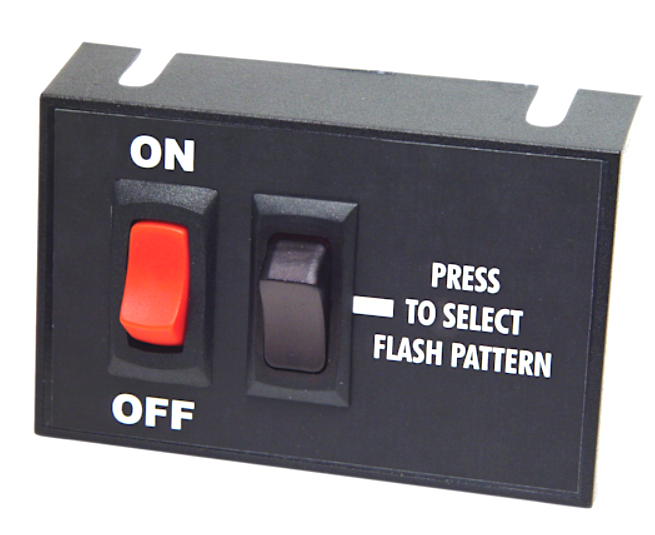 The switch provides on/off control and flash pattern selection on all products that utilize a single wire flash pattern selection system. The on/off switch is an illuminated toggle switch for 12V systems use only. The pattern selection switch is a momentary push-button which supplies +12V to the flash pattern trigger wire when pressed.