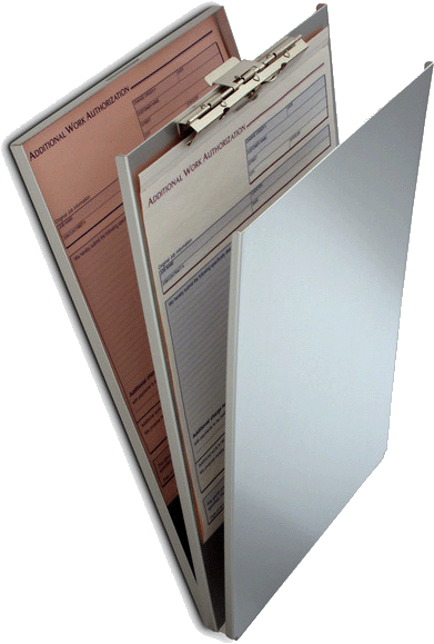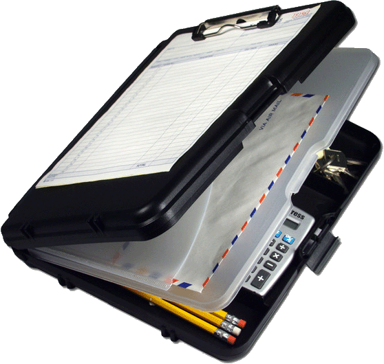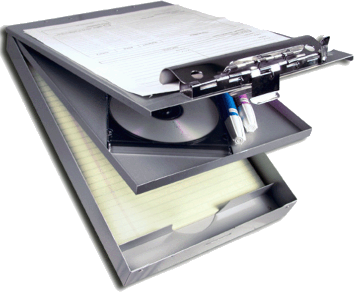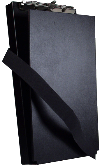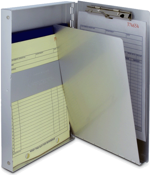 • Hinged writing plate conceals documents and prevents write through multi-part forms